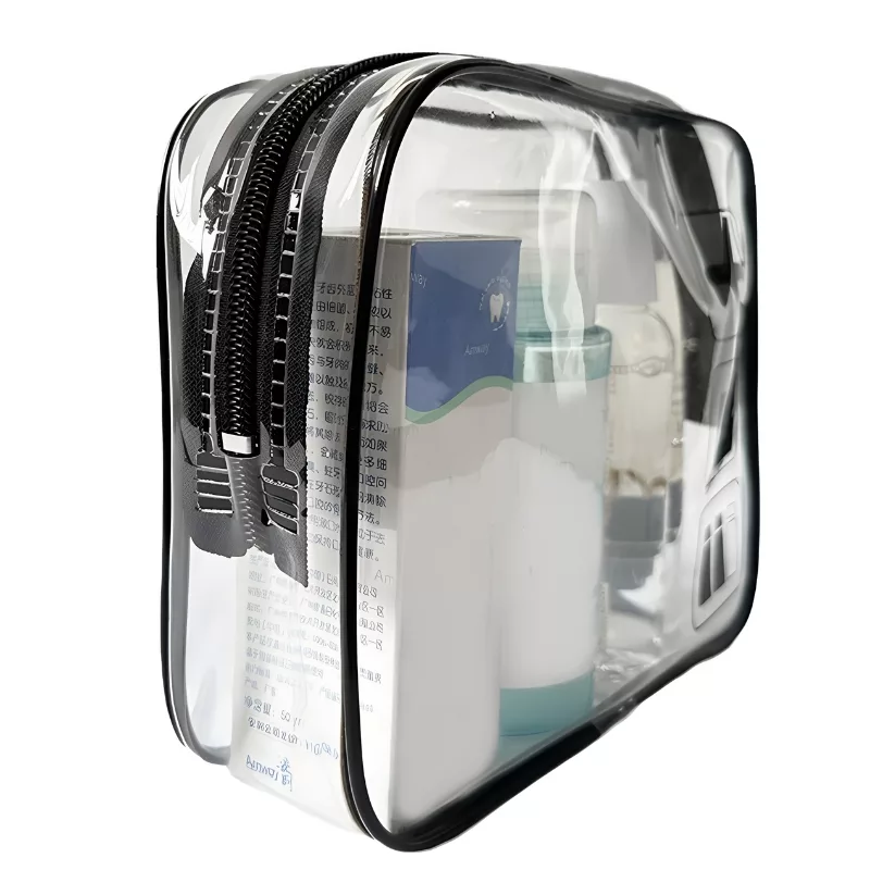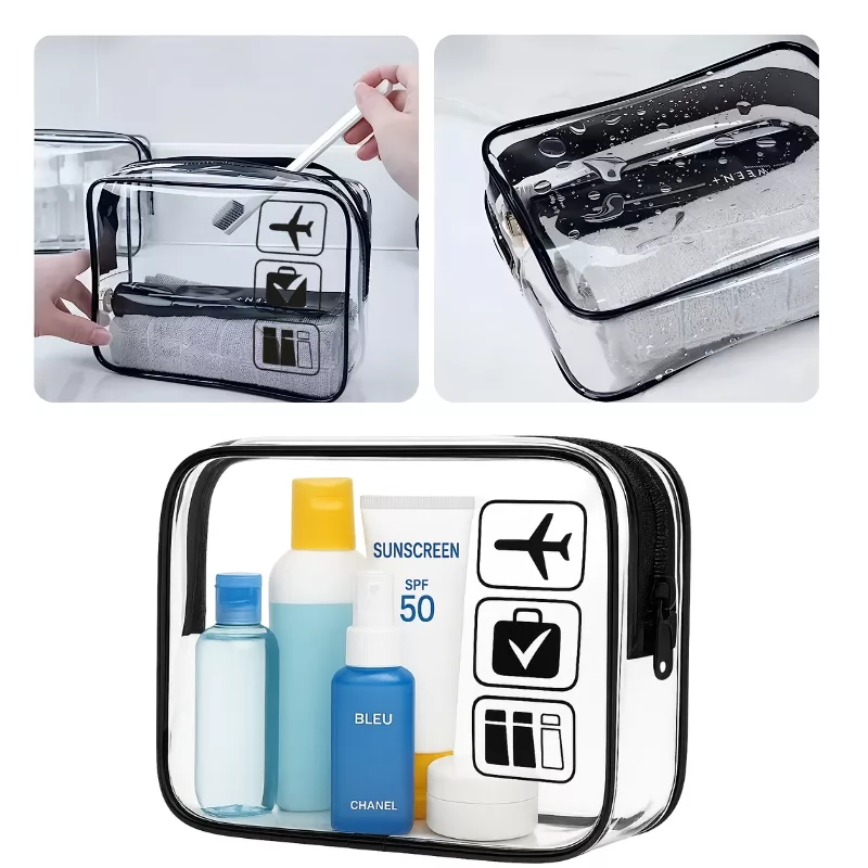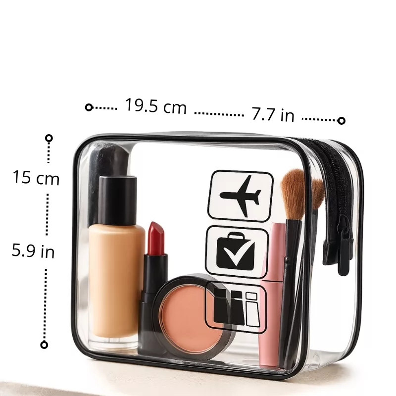 Esta bolsa de viagem é uma salvadora de vidas! Cabe todos os meus produtos de higiene pessoal e maquiagem. Adoro como é fácil encontrar tudo com o design transparente.